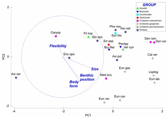With the data obtained, the densities of individuals and colonies with each level of coverage–entanglement in each OTU were estimated per square metre and also as percentage of individuals of each level within each OTU, with the aim of finding which OTUs displayed the maximum levels of coverage–entanglement of drifted thalli. Moreover, four biological traits of the top dominant OTUs were considered in order to know which ones were mainly related to the amount of detached thalli of R. okamurae that hook to the OTUs. In this sense, a one-way PERMANOVA was used for testing each biological trait based on the Bray–Curtis similarity index and using square root transformed data of the abundance of the top-dominant OTUs in relation to the different coverage–entangling levels by R. okamurae drifted thalli, in order to achieve homogeneity in the variance. Biological traits were analysed as fixed factors and included (1) benthic position with 3 levels: surface, 2–20 cm height from the seabed, and >20 cm; (2) body form with 4 levels: flattened, globulose, erect but not branched, and erect and branched; (3) size with 4 levels: small (<2 cm), medium (2–10 cm), medium-large (>10 and <50 cm), and large (>50 cm); and (4) flexibility with 3 levels: none, low (between 10° and 45°), and high (>45°). Levels of biological traits were similar to those used by []. Finally, principal component analysis (PCA) was performed to graphically explore differences between OTUs in relation to the quantity of R. okamurae drifted thalli covering–entangling on them and the relationships of the different biological traits considered. Multivariate routines were implemented in PRIMER 6.0 + PERMANOVA [].