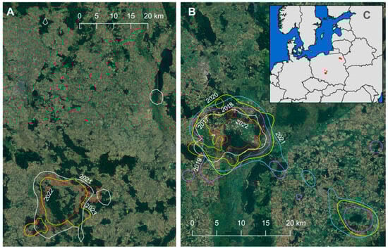 The home ranges of breeding males extended to encompass external foraging sites, as illustrated in Figure 2. HALB11, during one of the studied years, utilized a waterbody located 45 km from its nest (Figure 2A). In the case of BIEL05, during years of successful breeding (Table S1), it frequently employed a waterbody located 29 km from its nest for foraging (Figure 2B and Figure S2). In other years, its primary foraging site consisted of a large artificial channel situated on the periphery of a vast wetland, specifically within the Biebrza National Park.