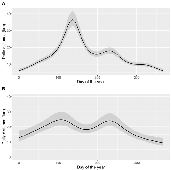 Comparison of adult white-tailed eagle daily distance covered by breeders (A) and floaters (B) tracked with GPS loggers. Black line shows the trend calculated with generalized additive models with 95% confidence interval (dark grey).