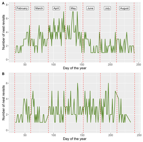 The other male (HALB11) revisited the nest site less frequently, averaging 1.99 times per day during a successful breeding season. The number of nest revisits reached its peaks in April, May, and June, with 2.4, 2.6, and 2.5 revisits per day, respectively. However, the number of revisits dropped significantly in August (0.9), when he ceased visiting the nest for approximately half of the month.