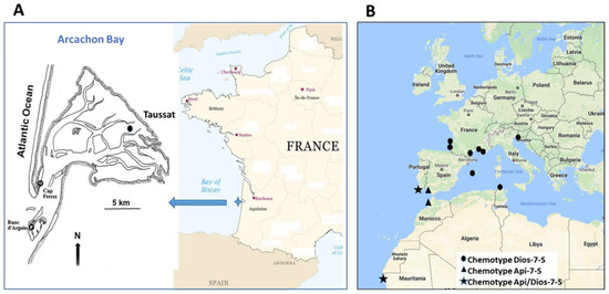 Map showing the location of sampling sites. (A) Arcachon Bay; (B) other sites in the Atlantic and Mediterranean (see Table 1 for GPS coordinates).