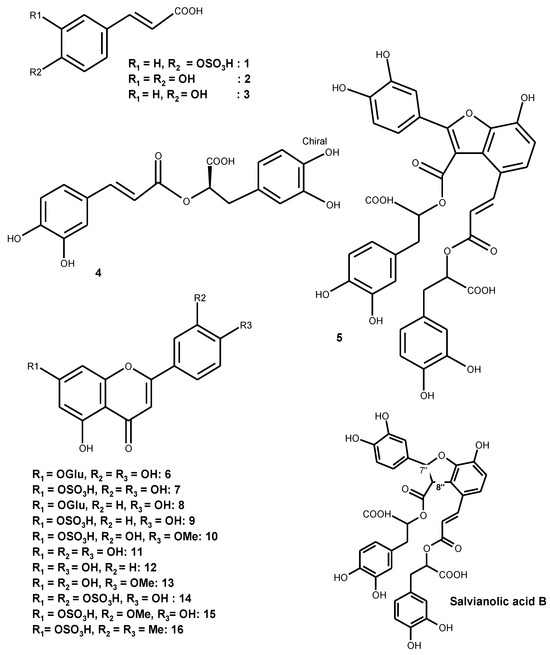 Structures of the phenolic compounds found in Nanozostera noltei and Zostera marina. 1: zosteric acid; 2: caffeic acid; 3: coumaric acid; 4: rosmarinic acid; 5: zosteranoic acid; 6: luteolin 7-glucoside; 7: luteolin 7-sulfate; 8: apigenin 7-glucoside; 9: apigenin 7-sulfate; 10: diosmetin 7-sulfate; 11: luteolin; 12: apigenin; 13: diosmetin; 14: luteolin 3′-disulfate; 15: chrysoeriol 7-sulfate; 16: luteolin 3′,4′-dimethyl ether 7-sulfate.