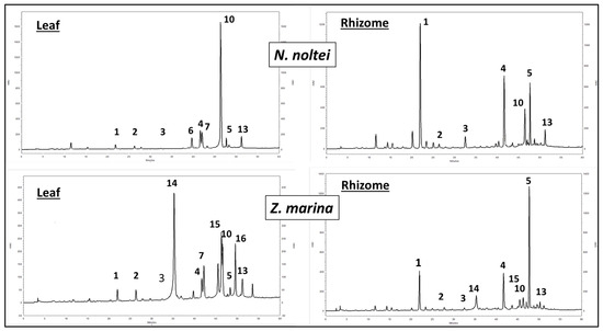 Top: HPLC profile of Nanozostera noltei crude extract (recorded at 280 nm) from leaves (left) and rhizomes (right). Bottom: HPLC profile of Zostera marina crude extract (recorded at 280 nm) from leaves (left) and rhizomes (right). Peak number assignments—1: zosteric acid; 2: caffeic acid; 3: coumaric acid; 4: rosmarinic acid; 5: zosteranoic acid; 6: luteolin 7-glucoside; 7: luteolin 7-sulfate; 10: diosmetin 7-sulfate; 13: diosmetin; 14: luteolin 7,3′-disulfate; 15: chrysoeriol 7-sulfate; 16: dimethoxyluteolin 7-sulfate. Compounds are coded as in Table 2, Table 3, Table 4 and Table 5 and Figure 2.