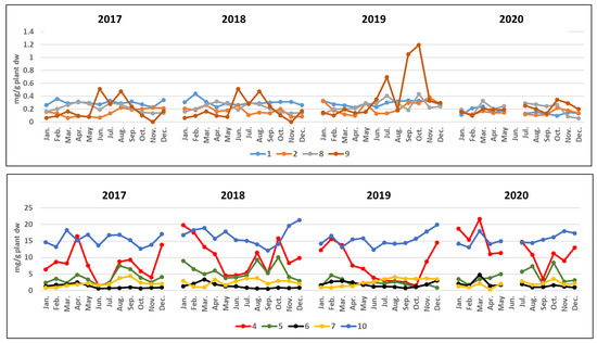 Variation of the quantitative amounts of phenolic compounds in N. noltei leaves over months and years. (Top)—minor compounds. 1: zosteric acid; 2: caffeic acid; 8: apigenin 7-O-glucoside; 9: apigenin 7-sulfate. (Bottom)—major compounds. 4: rosmarinic acid; 5: zosteranoic acid; 6: luteolin 7-O-glucoside; 7: luteolin 7-sulfate; 10: diosmetin 7-sulfate. Compounds are coded as in Table 2, Table 3, Table 4 and Table 5 and Figure 2. Quantitative amounts of compounds 1–4 are expressed in mg per g of N. noltei–plant DW, and those of compounds 5 to 10 in mg of standard equivalents per g of N. noltei DW, with the standards used being, respectively, 5: rosmarinic acid, 6–7: luteolin, 8–9: apigenin and 10: diosmetin. Compared to rosmarinic acid, the seasonality of the caffeic tetramer 5 is less marked and the production peak tends to occur regardless of the season (1.51–7.56 (2017), 3.82–10.05 (2018), 0.87–4.64 (2019) and 1.69–8.44 mg/g plant DW (2020)). Zosteric (1) and caffeic (2) acids are much less abundant than 4 and 5 and show a relatively low variability from season to season and year to year (respectively, 0.10–0.43 and 0.07–0.38 mg/g plant DW over the four years of monitoring). Coumaric acid (3) was only found in six samples and in very small amounts (0.024–0.048 mg/g plant DW) (Figure 5).