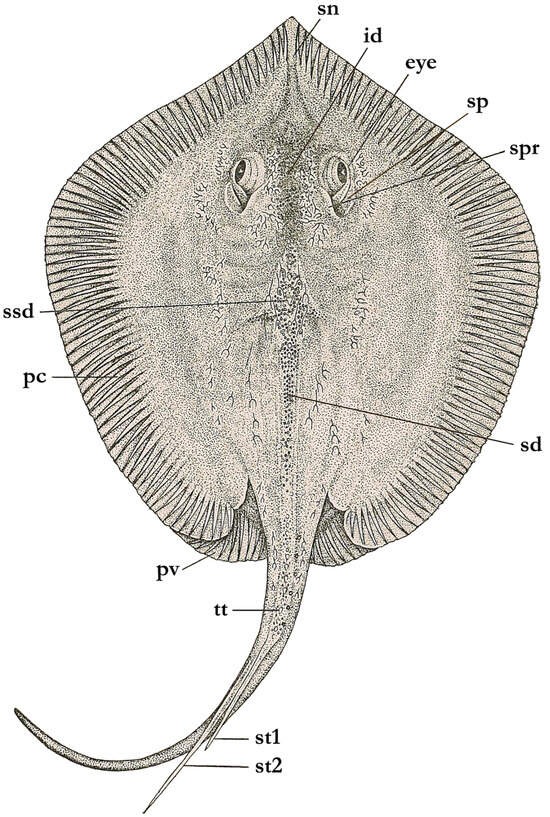 - Scharpf, C. The ETYFish Project. Family Dasyatidae Jordan & Gilbert 1879 (Stingrays). Available online: https://etyfish.org/dasyatidae (accessed on 22 June 2023).