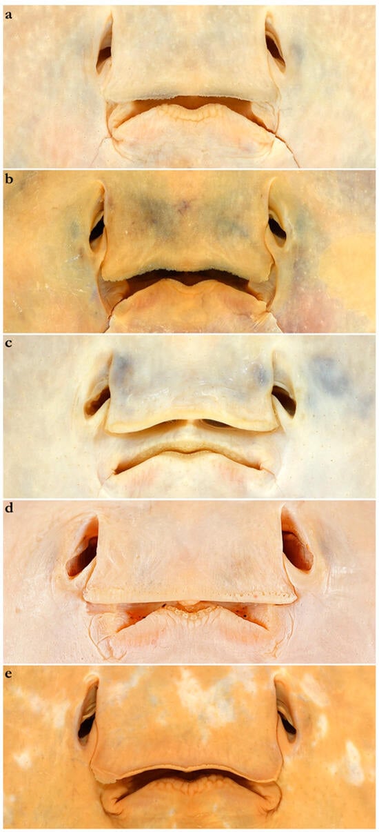 Oronasal region of (a) Brevitrygon imbricata, non-type NTM S 13160-009, female 186 mm DW, Sri Lanka (preserved); (b) B. walga, non-type CSIRO H 8666-01, female 233 mm DW, Myanmar (preserved); (c) B. heterura, non-type CSIRO H 5584-07, female 200 mm DW, Sabah, Malaysia (preserved); (d) B. javaensis, holotype MZB 21461, female 164 mm DW, Cilacap, Indonesia (preserved); (e) B. manjajiae sp. nov., holotype USNM 222555, adult male 231 mm DW, Pakistan (preserved).
