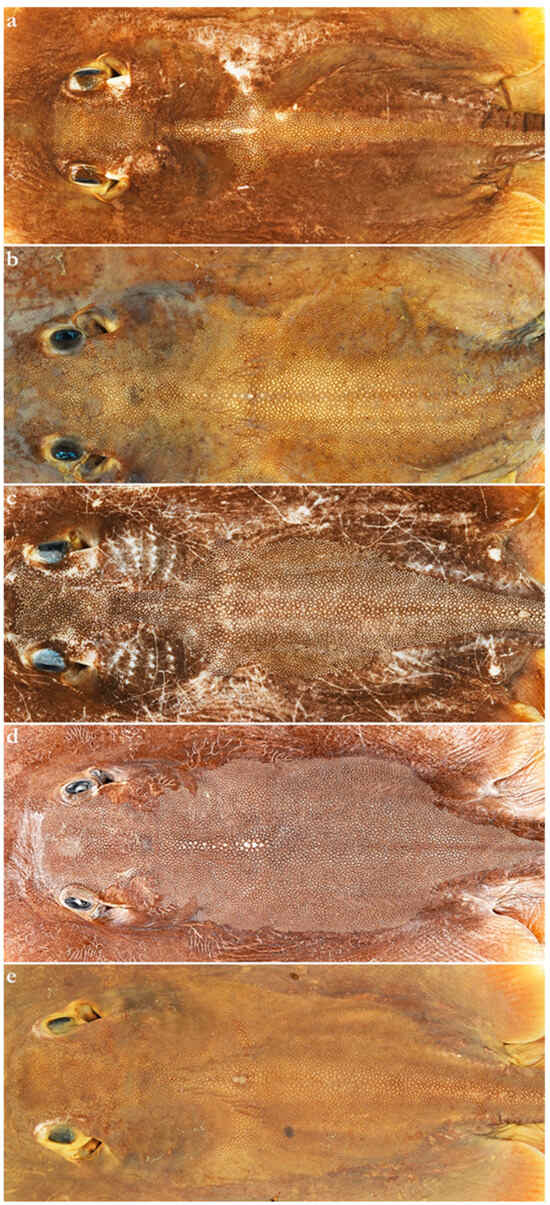 Juveniles. Two specimens, immature male (121 mm DW) and a smaller female (88 mm DW, Figure 12a) differ from adults in having a shorter (direct preorbital snout length 27.8–28.7% DW), less angular snout and less concave snout margin; small primary denticle forming in scapular region of male but absent in smaller female; no secondary denticle band formed at this stage; dorsal surface pale yellowish, uniformly white ventrally. As in adults, the disc is slightly longer than wide (1.01–1.03 times longer) and the tail is short relative to the disc size (total length 1.95–1.98 times DW) compared to other Brevitrygon species.