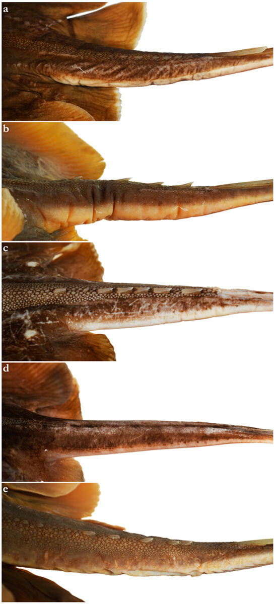 Squamation in the genus Brevitrygon—dorsolateral view of pre-sting tail. (a) B. imbricata, non-type NTM S 13160-009, female 186 mm DW, Sri Lanka (preserved); (b) B. walga, non-type CSIRO H 8666-01, female 233 mm DW, Myanmar (preserved); (c) B. heterura, non-type CSIRO H 5584-07, female 200 mm DW, Sabah, Malaysia (preserved); (d) B. javaensis, holotype MZB 21461, female 164 mm DW, Cilacap, Indonesia (preserved); (e) B. manjajiae sp. nov., holotype USNM 222555, adult male 231 mm DW, Pakistan (preserved).