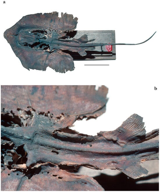 Raja imbricata Bloch & Schneider (=B. imbricata), holotype ZMB 7585, adult male ~171 mm DW, Tharangambadi, India: (a) dorsal surface, dry mounted; (b) close up of the typically narrow secondary denticle band on the disc and anterior tail. Scale bar: 5 cm.