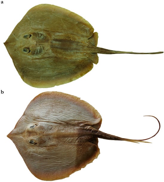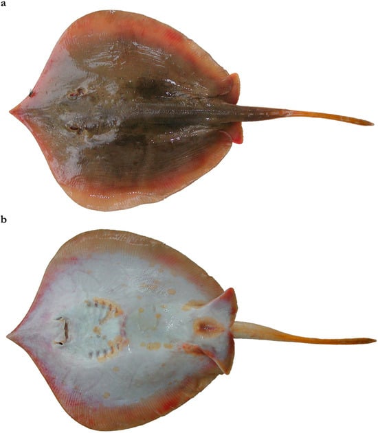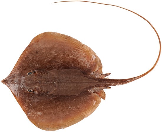 - Last, P.R.; Compagno, L.J.V. Dasyatidae. In FAO Species Identification Guide for Fishery Purposes. The Living Marine Resources of the Western Central Pacific. Volume 3 Batoid Fishes, Chimaeras and Bony Fishes Part 1 (Elopidae to Linophrynidae); Carpenter, K.E., Niem, V.H., Eds.; FAO: Rome, Italy, 1999; pp. 1479–1510. [Google Scholar]