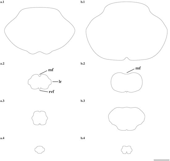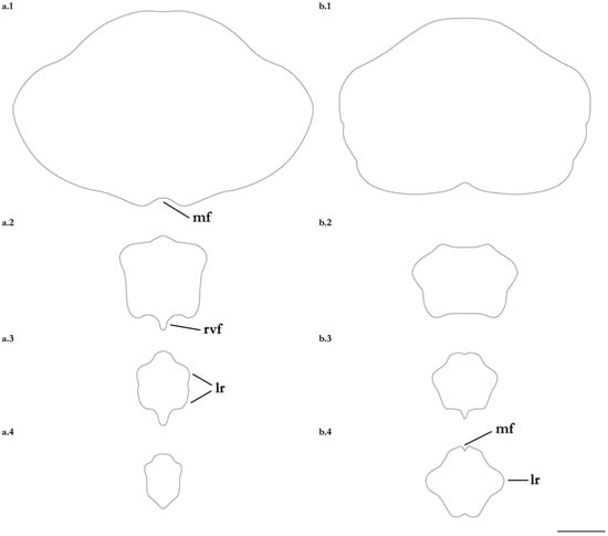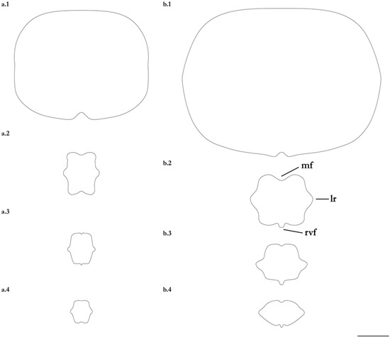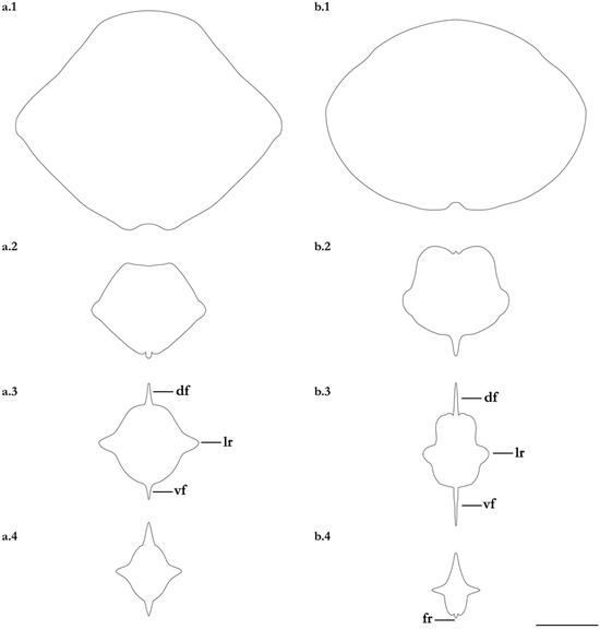 Schematic cross-sections of the post-sting tail of Brevitrygon imbricata for (a) non-type BPBM 27597, adult male 205 mm DW, Kerala, India; and (b) non-type NTM S 13160-009, female 186 mm DW, Sri Lanka. Sections taken at: 1. sting origin; 2. axis 25% from origin; 3. through midlength; and 4. axis 75% from origin. Abbreviations: df = dorsal cutaneous fold, fr = low fleshy ridge, lr = lateral ridge, vf = ventral cutaneous fold. Scale bar: 2 mm.