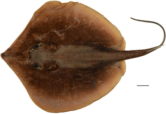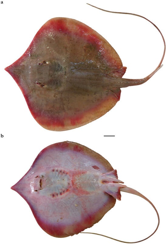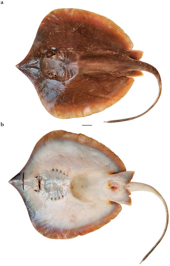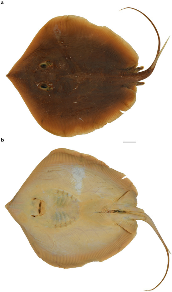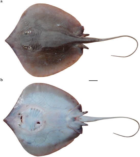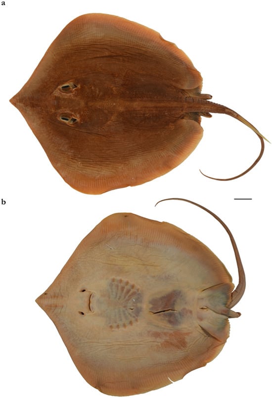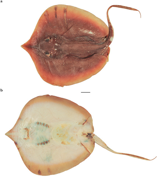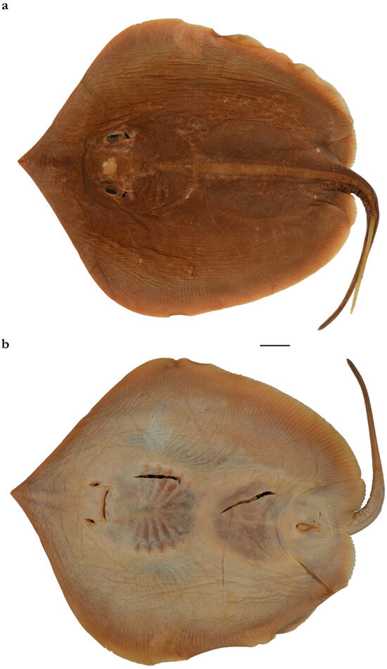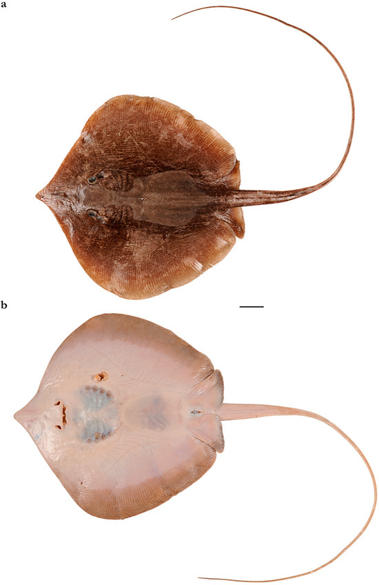 Brevitrygon cf. imbricata, non-type SAM—LJVC 517, adult male 185 mm DW, Taiwan: (a) dorsal surface, fresh; (b) ventral surface, preserved. Scale bar: 2 cm.