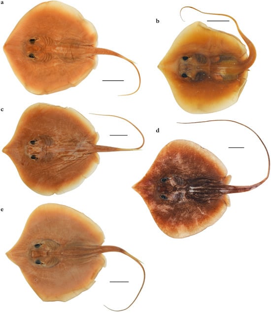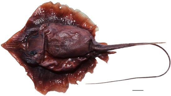 - Last, P.R.; Naylor, G.J.P.; Manjaji-Matsumoto, B.M. A revised classification of the family Dasyatidae (Chondrichthyes: Myliobatiformes) based on new morphological and molecular insights. Zootaxa 2016, 4139, 345. [Google Scholar] [CrossRef]