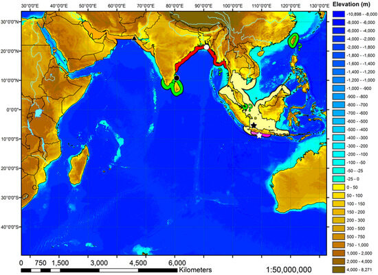 The remaining four taxa are fully resolved with B. manjajiae sp. nov. and B. imbricata apparent successive sister species to B. heterura + B. walga. Two of these species, B. javaensis and B. heterura, are confirmed to be sympatric off Java, Indonesia; B. imbricata is sympatric with B. walga in the Bay of Bengal and may be (or once may have been) sympatric with B. heterura in the western North Pacific. Derivation of these taxa likely arose from allopatric speciation, and the present distribution of the species, B. manjajiae sp. nov (Arabian Sea, Persian/Arabian Gulf), B. imbricata (southern India to Myanmar), B. walga (Bay of Bengal), and B. heterura (Indo-Malay Archipelago), reflects this evolutionary pattern (Figure 13).