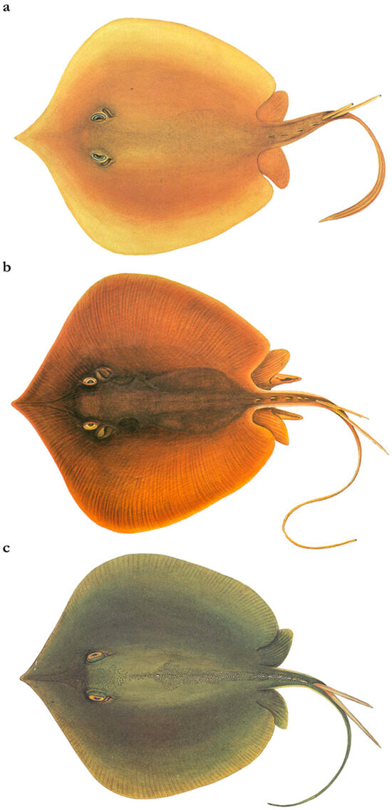 Illustrations of Brevitrygon from Bleeker’s (1874) ichthyological atlas: (a) Leiobatis (Himantura) heterurus (=B. heterura, female, Pl. 35, 1a,b); (b) Leiobatis (Himantura) walga (=B. heterura, male, Pl. 41, 1a,b); (c) Leiobatis (Himantura) dadong (=B. imbricata, Pl. 36, 1a).