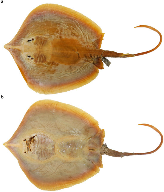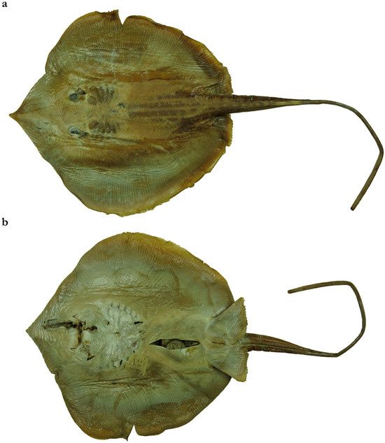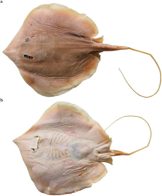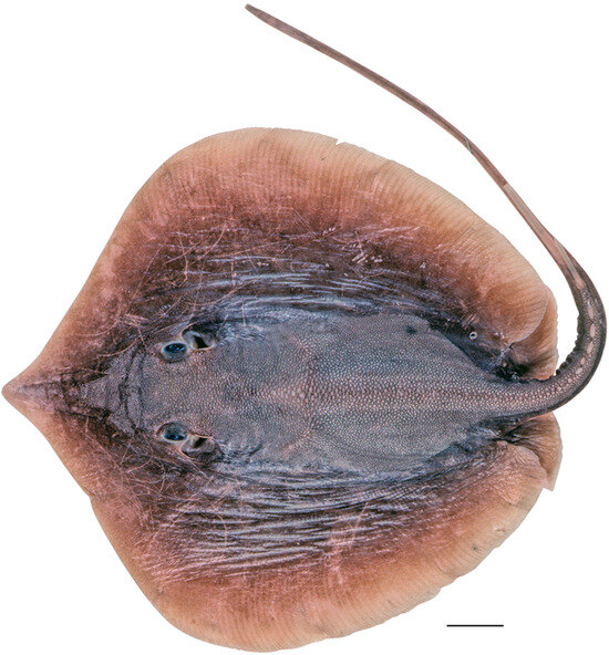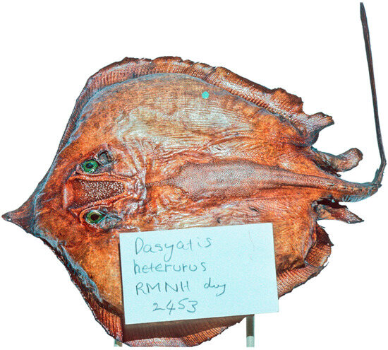 - Last, P.R.; Manjaji-Matsumoto, B.M.; Naylor, G.J.P.; White, W.T. Stingrays, Family Dasyatidae. In Rays of the World; Last, P.R., White, W.T., de Carvalho, M.R., Séret, B., Stehmann, M.F.W., Naylor, G.J.P., Eds.; CSIRO Publishing: Melbourne, Australia, 2016; pp. 522–618. [Google Scholar]
