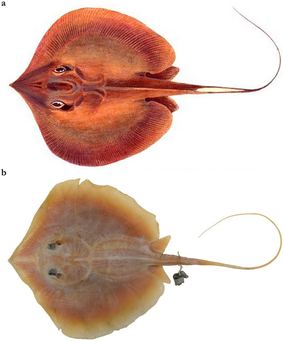- Séret, B.; McEachran, J.D. Catalogue critique des types de Poissons du Muséum national d’Histoire naturelle. (Suite) Poissons Batoïdes (Chondrichthyes, Elasmobranchii, Batoidea). Bull. Mus. Natl. Hist. Nat. 1987, 8, 3–50. [Google Scholar] [CrossRef]