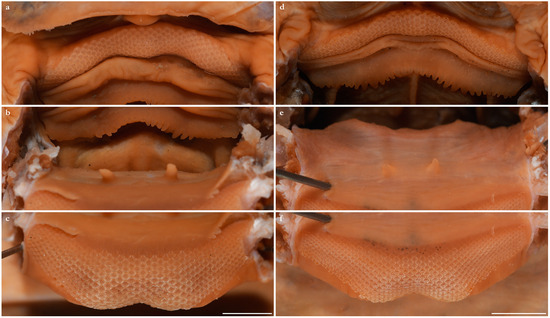Squamation of the central disc in the genus Brevitrygon—secondary denticle band. (a) B. imbricata, non-type NTM S 13160-009, female 186 mm DW, Sri Lanka (preserved); (b) B. walga, non-type CSIRO H 8666-01, female 233 mm DW, Myanmar (preserved); (c) B. heterura, non-type CSIRO H 5584-07, female 200 mm DW, Sabah, Malaysia (preserved); (d) B. javaensis, holotype MZB 21461, female 164 mm DW, Cilacap, Indonesia (preserved); (e) B. manjajiae sp. nov., holotype USNM 222555, adult male 231 mm DW, Pakistan (preserved).