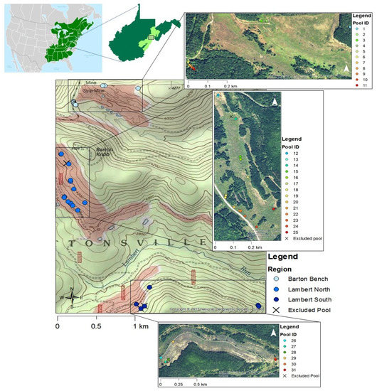 We sampled created vernal pools in Huttonsville, WV, USA, from May–June in 2015 and 2016 (Figure 1). Sampled vernal pools were located on Cheat Mountain in Monongahela National Forest at altitudes of 1219–1296 m above sea level. All sampled vernal pools were created by the U.S. Forest Service (USFS) and situated such that pools built in the same year are geographically proximate (hereafter considered three regions): Barton Bench pools were created in 2011, Lambert North pools in 2013, and Lambert South pools in 2014. All sampled vernal pools were within 5 km of each other and created based on field conditions without predetermined designs or specifications as part of more extensive restoration projects. The USFS acquired these areas in the 1980s after they were strip-mined for coal in the 1970s. The restoration was initiated in 2009 and included the removal of non-native Norway spruce (Picea abies) and red pine (Pinus resinosa) planted during mine reclamation, ripping to mitigate soil compaction, and planting saplings including aspens (Populus spp.), red spruce (Picea rubens), black cherry (Prunus serotina), wild raisin (Viburnum nudum), elderberry (Sambucus nigra), and serviceberry (Amelanchier arborea). Most vernal pools included in this study had open canopy due to the recent removal of non-native trees. Mean monthly temperatures in Huttonsville, WV range from −1–19 °C with average annual precipitation of 172.5 cm [23].