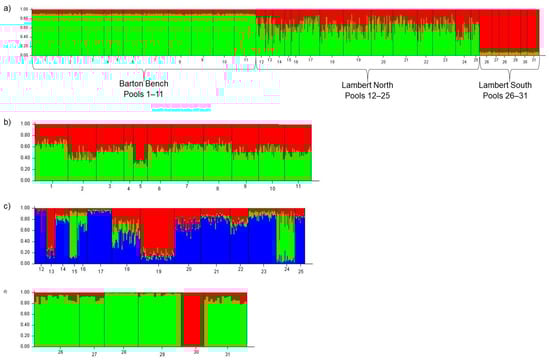 STRUCTURE barplots most likely displaying K. Colors indicate the individual membership coefficients for each cluster. Numbers reflect pool IDs. (a) Barplot for entire study area including all three regions (Barton Bench, Lambert North, Lambert South); most likely K = 1. (Presenting barplot K = 2 to visually display the allele proportions reflecting a cline across regions.) (b) Barplot for pools in Barton Bench region created in 2011; most likely K = 1. [Presenting barplot K = 2 to visually display the allele proportions reflect K = 1] (c) Barplot for pools in Lambert North region created in 2013; most likely K = 3. (d) Barplot for pools in Lambert South region created in 2014; most likely K = 2.