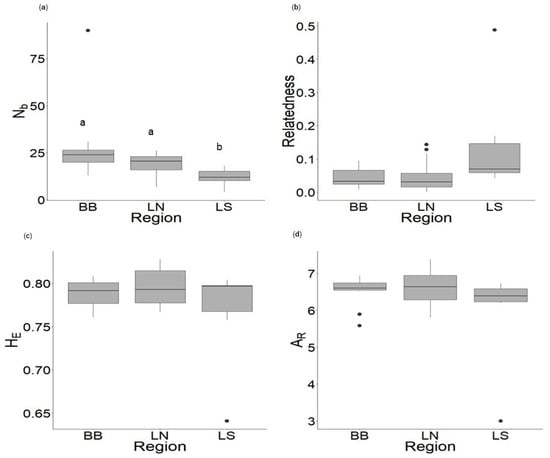Boxplots displaying ranges in (a) effective number of breeders (Nb), (b) relatedness, (c) expected heterozygosity (HE), and (d) allelic richness (AR) for spotted salamanders (Ambystoma maculatum) across regions: Barton Bench (BB; N = 11), Lambert North (LN; N = 14), Lambert South (LS; N = 6). Letters indicate significant differences between regions (Dunn’s Test p < 0.05).