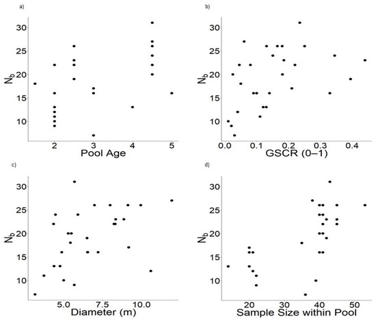 Biplots displaying the relationship between Nb and predictors from the most robust model including: (a) age of pool, (b) GSCR (0–1) (grass, sedge, cattail, and rush coverage within pool), (c) diameter (m) of pool, and (d) sample size within the pool. Some ages are in-between years due to combining samples collected over two years.