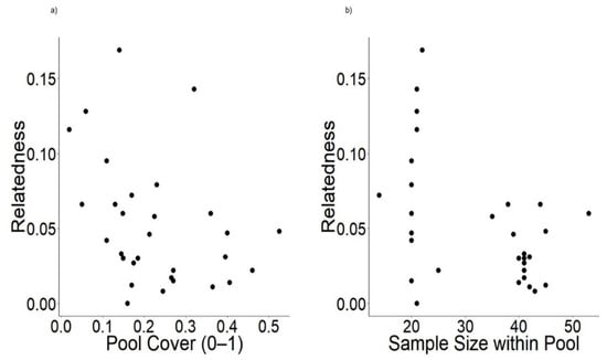 Biplots displaying the relationship between relatedness and predictors from the strongest model including: (a) GSCR (0–1) (grass, sedge, cattail, and rush coverage within pool) and (b) sample size within pool.
