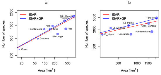 where d is a positive constant (for more recent developments see [1]). However, often islands do not occur in isolation but in archipelagos. It is, then, to be expected that the species richness on an island is not only influenced by its area and distance to the mainland but also by the distance to the other islands in the archipelago [16]. For instance, the distance among islands is likely to affect the ability of species to disperse within the archipelago, which may affect not only species richness but also species composition (and beta-diversity) [16,17,18]. The latter is not the object of this work; however, closeness may affect species richness because it is likely to be a proxy for similar environmental conditions and for the islands’ age [16]. Moreover, some islands may have been connected during glacial periods, which is more likely to have occurred for nearby islands, and their present communities may still reflect a previous species’ richer community [2]). Therefore, when trying to fit an ISAR, the distance among islands should be incorporated into the model.