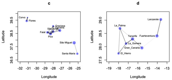 For each island, we compiled information on the area, geological age, maximum altitude above sea level (elevation) and distance to the mainland [36,37,38,39,40,41,42]; see also Tables S1 and S2 in Supplementary Material S1). The distances between the islands were estimated using the Haversine formula and the centroid of each island; see Tables S3 and S4 in Supplementary Material S1.