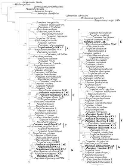 Our phylogeny showed the Caespitosa species distributed in seven morphologically distinct clades (Figure 1A–G). As most previously infrageneric categories recognized in Paspalum (i.e., subgenera, sections, and informal groups) failed to define monophyletic groups [,,,,,,,,,,,,,,,,,], here we presented a limited discussion about relationships of Caespitosa taxa, since the current tree is not strongly supported enough to warrant taxonomic revision of the recovered clades.