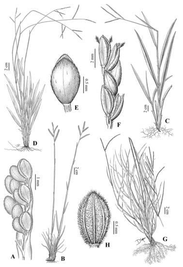 - Zuloaga, F.O.; Morrone, O.; Davidse, G.; Filgueiras, T.S.; Peterson, P.M.; Soreng, R.J.; Judziewicz, E.J. Catalogue of New World Grasses (Poaceae): III. Subfamilies Panicoideae, Aristidoideae, Arundinoideae, and Danthonioideae. Contr. U.S. Natl. Herb. 2003, 46, 1–662. [Google Scholar]