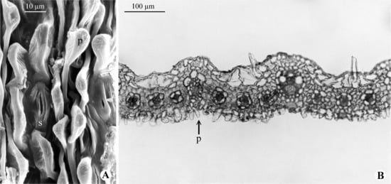 Paspalum indecorum: (A) Scanning electron micrograph of the abaxial surface of leaf blade (s = stomata; p = papilla); (B) Light micrograph of leaf blade in cross section showing abaxial papillae (p) [(A): Montes 12739 (US); (B): F.O. Zuloaga 506 (SI)]. Extracted from [].
