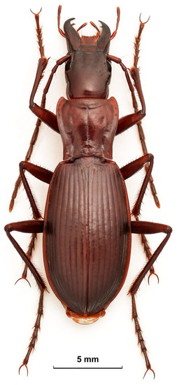 - Casale, A. Subtribe Sphodrina Laporte, 1834. In Catalogue of Palaearctic Coleoptera. Volume 1. Archostemata–Myxophaga–Adephaga. Revised and Updated Edition; Löbl, I., Löbl, D., Eds.; Brill: Leiden, The Netherlands, 2017; pp. 773–790. [Google Scholar]