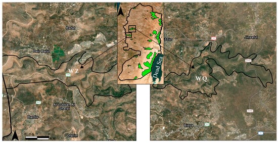 The study areas of Wadi Qana (WQ) and Wadi Ein Al-Zarqa Al-Ulwi (or, simply, Wadi Zarqa) (WZ) are two valleys in the central highlands of Palestine (northern part of the West Bank). Their elevations are similar, with the west-to-east elevational level above the sea level inside the west bank going from about 120 m to 450 m for WZ and from 240 to 700 m for WQ. Both are about 20 km long and lie within rugged mountains and deep valleys, which expose mostly Cenomanian geologic formations. The average minimum temperature ranges from 8 to 12 °C during winter, and the average maximum temperature ranges from 22 to 28 °C in summer. Both receive an average annual rainfall of 600–700 mm (depending on the location within the two areas) and have mild winters and hot and dry summers.