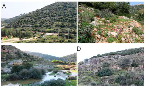 Floral habitats of Wadi Qana. (A): Entrance of the valley from the main road shows a hill with typical Mediterranean undisturbed oak forest and, below it, pine trees at the road intersection; (B): Batha and Garigue areas; (C): near one of the springs in the valley with Juncus and other hydrophilic plants; (D): cliff side with natural areas and olive cultivation in the valley.