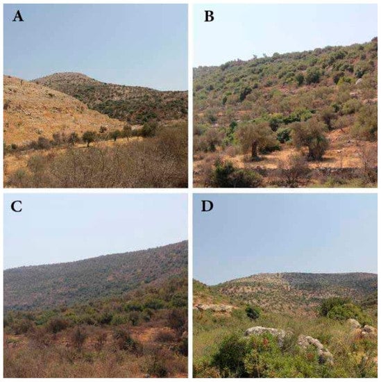 Habitats in WZ: (A): Olives in the valley with different coverages of vegetation on two sides of the valley; (B,C): Typical Mediterranean habitats of oaks, carobs, and hawthorn on the less accessible hills, but human cultivation of trees in the valley; (D): Less dense Garigue vegetation in the western part of valley and hillside (mostly shrubs).