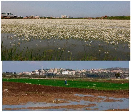 The list is of species in the actual protected areas. However, there are buffer zones near both WZ and WQ that are of interest. Temporary vernal ponds (referred to in Arabic by the term “Balu”) are found in both areas, but with very different species compositions due to the differences in the length of time during which water remains and the fact that the Uskar pond near WQ is basic (pH = 8.5–8.6), as it sits on karstic soils. The Uskar pool near WQ (Figure 4) is basic (pH = 8.5–8.7) and lasts until summer (June and even into July), and it has unique plants. Most of them were not seen elsewhere in our surveys in the West Bank and were not found in the core zone of the protected area: Ranunculus peltatus. Lemna gibba, Eleocharis palustris, Crypsis factorovskyi, Trifolium fragiferum, Arum hygrophilum, and Glinus lotoides [17]. The plain of Deir Ballut is far larger (about 600–700 m in width compared to Uskar, which is only 12–15 m in width) and retains water for much shorter periods (until April at the latest) because it sits on Terra Rosa soils. The latter, while less unique in our region than the vernal pool in the WQ buffer zone, was noted to have at least two species of crustaceans that are of conservation interest and are being studied now.