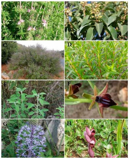 Selected plants in WZ. (A). Satuja thymbra. (B). Arbutus andrachne. (C). Vitex agnuscastus. (D). Thymbra spicata. (E). Salvia fruticose. (F). Ophrys cf. adonidis. (G). Scilla hyacinthoides. (H). Serapias vomeracea.