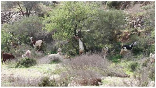 Overgrazing: We observed many herds of sheep and goats grazing within the lowlands of both study sites. Goats can climb and feed on trees and shrubs (Figure 7), while sheep feed on annual plants and grasses. The grazing period occurs from March to November, with animals switching from green to dry plant material in May. Thus, this will affect seed formation if grazing is not managed.