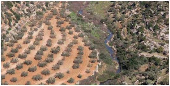 Flow of untreated sewage in part of the WZ PA. The picture also shows olive trees planted in the valley and small remaining natural areas on the steeper hills.