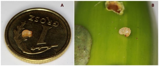 Larvae of the second instar with light brown head capsule, which indicates that the individual is newly molted: (A)—larva on a coin of 15.5 mm diameter; (B)—larva next to the prepared infestation hole.