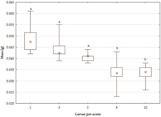 Distribution of larval masses in acorns inhabited by one, three, five, eight and ten larvae, respectively. Markings: squares—medians, box—quartile range (25–75%), whiskers—min/max values; different lowercase letters indicate significant differences (Dunn’s post-hoc, p < 0.05).