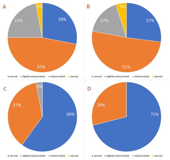 Larval mass categories in experimental acorns with a different numbers of larvae: (A)—ten larvae; (B)—eight larvae; (C)—five larvae; (D)—three larvae. The percentages are based on a sample size of 58, 67, 186 and 22 larvae, respectively.