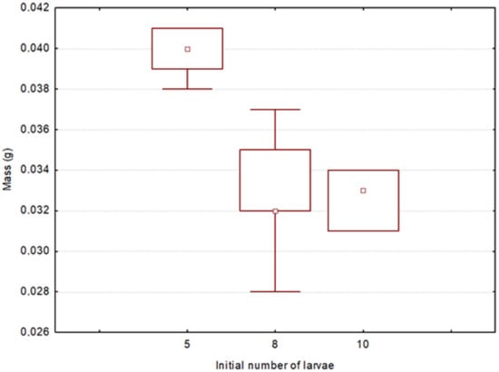 Distribution of larval masses in acorns with a final number of five larvae per acorn and an initial one of five, eight and ten larvae. Markings: squares—medians, box—quartile range (25–75%), whiskers—min/max values.