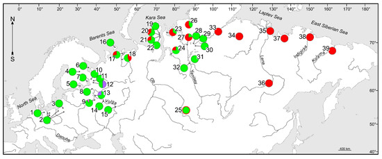 The distribution of phylogenetic mitochondrial lineages of considered cisco species over waterbodies of Arctic Eurasia: red circles—lineage IC, green—IIC, light purple—IIIC, pink—IVC. Location of populations: 1–Lake Stechlin (C. albula and C. fontanae); 2–lakes of Poland: Bytyń, Płociowe, Drawsko, Marta, Miedwie, Morzycko, Wigry, Ostrowieckie, Żerdno, and Narie; 3–Lake Vištytis, Kaliningrad Region; 4–Lake Khedo; 5–Lake Ladoga; 6–lakes of the Solovetsky Archipelago: Bol’shoye Krasnoye, Gremyacheye, and Bol’shoye Ostrech’ye; 7–Lake Onega; 8–Lake Beloye; 9–Lake Pleshcheyevo; 10–Lake Vodlozero; 11–Lake Kenozero; 12–Lake Lyokshmozero; 13–Rybinsk Reservoir; 14–Gorky Reservoir; 15–Kuybyshev Reservoir; 16–waterbodies of the Kolguyev Island; 17–Pechora River, Lake Golodnaya Guba, saurey; 18–Pechora River, watercourse and estuary, zeld; 19–Nyakharvangata-Yakha River; 20–Sabetta-Yakha River; 21–Venujmue-Yakha River; 22–Lake Yoserotato; 23–Nyojta-Yakha River; 24–Messo-Yakha River; 25–Lake Ingol (introduced population of C. albula, denoted by red circle); 26–Pyasina River; 27–Yenisey River; 28–Lake Lama; 29–Lake Sobach’ye; 30–Lake Kutaramakan; 31–Kureyka Reservoir; 32–Yenisey River, Kureyka River mouth; 33–Khatanga River; 34–Anabar River; 35–Tiksi Bay; 36–Lena River; 37–Yana River; 38–Indigirka River; 39–Kolyma River. More detailed information about ciscoes samples is given in Table S1.