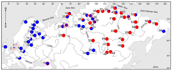 The distribution of phylogenetic mitochondrial lineages of whitefish over water bodies of Arctic Eurasia: red circles–lineage IW, subclade IW2, light pink–lineage IW, subclade IW1, blue–IIW. Location of populations: 1–Loch Lomond; 2–Vidaa River (C. oxyrhynchus); 3–waterbodies of Denmark: Nissum and Ringkøbing fjords, Kilen, lakes Tange and Flyder; 4–Achterwasser; 5–Lake Hallstatt and Koppentraun; 6–lakes of Poland: Sremski, Insko, Miedwie, Morzycko, and Marianovo; 7–Havgajávri; 8–Tuloma River; 9–Keret’ River; 10–Lake Topozero; 11–Lake Kamennoye; 12–Lake Onega; 13–Lake Ladoga; 14–the Gulf of Finland; 15–Baltic Sea, Estonian coast, 16–Lake Peipus; 17–Lake Kubenskoye (dwarf form of whitefish); 18–Lake Sevan (introduced population, denoted by red circle); 19–Sabetta-Yakha and Venujmue-Yakha rivers; 20–Lake Langtibeito; 21–Sob River; 22–Lake Varchaty and Voykar River; 23–Northern Sosva River; 24–Taz River; 25–Yenisey River; 26–Lake Lama; 27–Lake Sobach’ye, mokchegor; 28–Lake Sobach’ye, predator; 29–Lake Kutaramakan; 30–Irkingda River, lakes Keta and Khantayskoye; 31–Kureyka River; 32–Nizhnyaya Tunguska River; 33–Ayakhta River; 34–Lake Teletskoye; 35–Lake Todzha and Khamsara River; 36–Zakharova Rassokha River; 37–Popigay River; 38–Anabar River; 39–Olenek channel of the Lena River; 40–Olenek River (settlement of Taymylyr); 41–Olenek River (middle course); 42–Tiksi Bay; 43–Markha River; 44–Upper Lena River; 45–Buotoma River; 46–Lake Bolshoye Toko; 47–Lake Dorong; 48–Lake Kapylyushi, pidschian; 49–Lake Kapylyushi, C. l. baunti; 50–Omoloy River; 51–Yana River; 52–Khroma River; 53–Suturuokha River; 54–Moma River; 55–Kuydusun River, lakes Ichilyakh and Labynkyr; 56–Kolyma River; 57–Lake Ilirney; 58–Anadyr River. More detailed information about whitefish samples is given in Table S1.