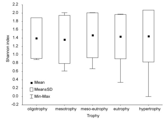 The Shannon index in 535 Polish lakes of different trophic status. Trophic conditions of the studied lakes were based on the trophic state index (TSI) of lakes, calculated from Secchi disc visibility according to Carlson [24]. SD = standard deviations.