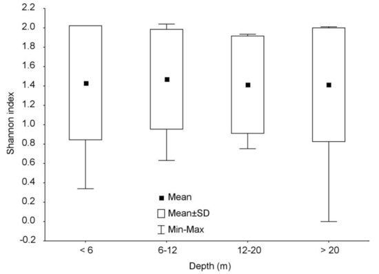 The Shannon index in 535 Polish lakes of different maximum depth. SD = standard deviations.