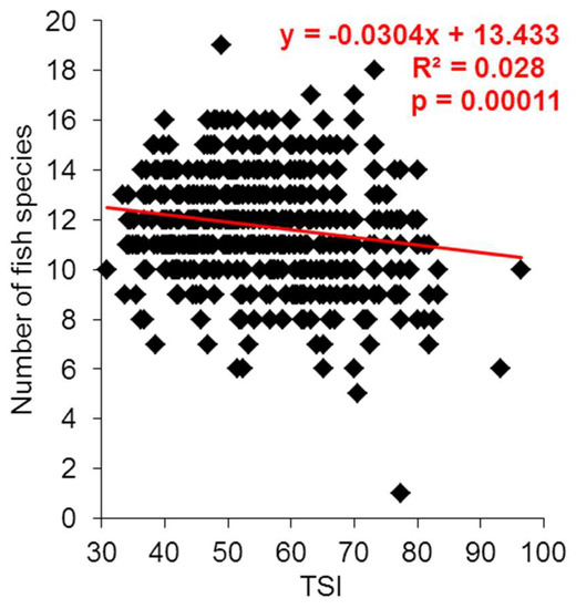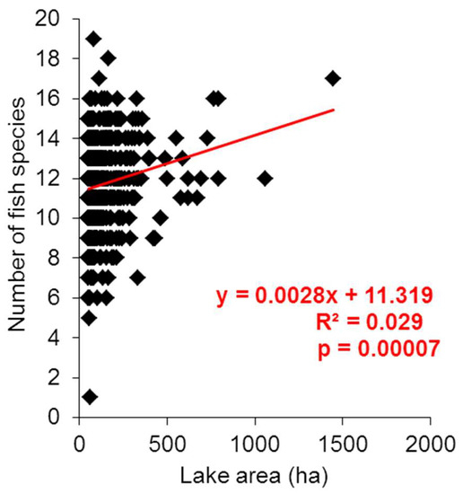 Fish, especially some species and/or groups of species, are defined by the term “keystone species” [1] or “strong interactor” [2]. The role of these organisms in the matter and energy flow in the trophic food web is disproportionate to their numbers and contribution to the total biomass of the biotic components of aquatic ecosystems [3]. Species richness and diversity of local fish in lakes are regulated by morphometric and (bio)geographic/climatic parameters [4]. Among the morphometric parameters, lake area and maximum depth are the most important [5,6,7]. Larger and deeper lakes in warmer regions are usually the richest in species and diversity [4]. The species composition and structure of fish in lakes and rivers of the northern hemisphere undergo substantial changes due to eutrophication [8,9]. The increase in lake trophic status is accompanied by a decrease in the number of fish species inhabiting the lakes [10]. Fish species characteristic of low productive waters (salmonids) are replaced by cyprinid fishes (mainly Rutilus rutilus, Abramis brama, Blicca bjoerkna, and Alburnus alburnus) in highly productive lakes [2,11]. The result of eutrophication and disturbances in the functioning of the aquatic environment is also a decrease in the numbers of Esox lucius, Tinca tinca, and Perca fluviatilis, which are particularly sensitive to adverse environmental changes [10,12].