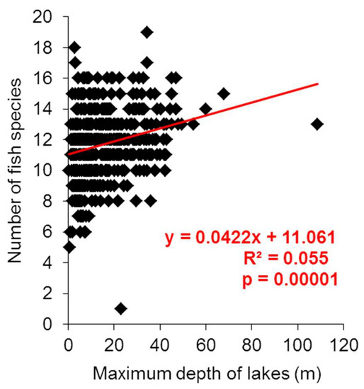 In lakes located in different parts of Europe, the fish species richness is shaped by different sets of variables. For example, in 161 Swedish lakes, productivity, lake area and maximum depth were important factors in determining the benthic fish communities [39]. In 796 Danish lakes, area, mean depth, and TP content contributed significantly and positively to the species richness of fish [37]. In 67 lakes in north-eastern Germany, fish community composition was mainly determined by maximum and mean depth, chlorophyll a concentration and lake volume [28]. In 1632 lakes from 11 European countries, productivity had a strong positive effect on fish species richness and diversity [4]. In 71 shallow Danish lakes [5] and 36 south Finnish lakes [6], fish species richness was unimodally related to total phosphorus and positively related to the lake area and/or mean depth. Other factors, such as habitat loss and degradation, species invasions, overharvesting and pollution [2], global warming [40], habitat modification, exploitation by fisheries, acidification, and the use of lakes for recreation [41,42] may also influence the local fish communities in lakes. In Polish lakes, species richness decreased with decreasing depth and trophic status of lakes. In deeper lakes, from 15 to 27 species of fish, while in the shallow eutrophic lakes 2 to 12 species or no fish are usually recorded [10]. Studies carried out in the lakes of the Bory Tucholskie National Park showed that 12 to 15 species of fish were present in the low-productive lake and the high-productive lakes where salmon fish (C. maraena and C. albula) can still live, while in other lakes of this type from 7 to 10 species, in shallow lakes from 0 to 4 species of fish were found [27]. In our study, lake area and maximal depth had a positive effect on fish species richness, but not on the species diversity (Shannon Index). We also found that species richness decreased with increasing trophic conditions of lakes. It is documented that the species richness of fish in lakes tends to increase with lake size and depth, probably due to the higher spatial complexity and habitat stability in large lakes than in small lakes [4,5,41].